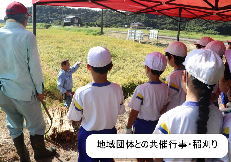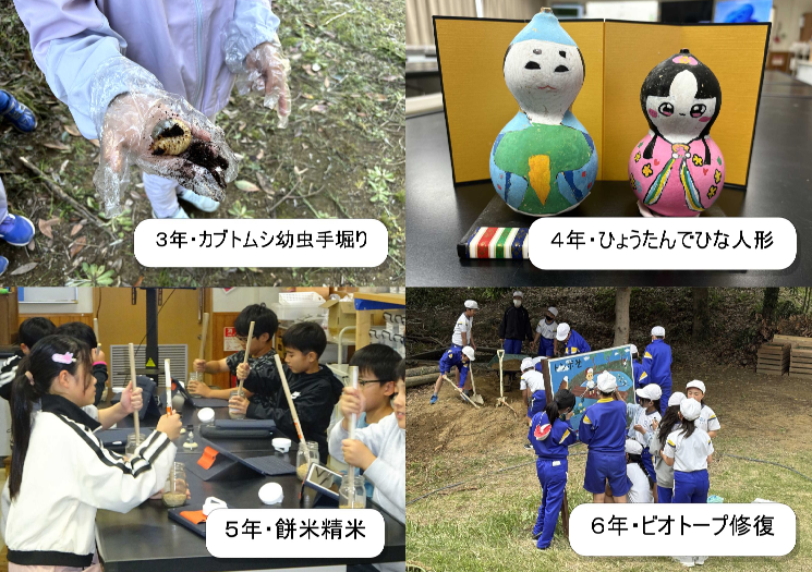 教育実践では、理科を中核とした地域資源の教材化を進めている。具体的には、第3学年ではカブトムシやチョウの野外飼育により、命のつながりの理解、第4学年ではヘチマやヒョウタン栽培による、ヘチマたわしやひな人形づくりの文化的活動への発展、第5学年では学区内産のもち米「マンゲツ」を用いたバケツ稲栽培から餅つき体験を実施することで地域の産業理解、第6学年では学校ビオトープを活用した食物連鎖や生物多様性の接続を進めている。また、ビオトープの修復(池・草地・堆肥場の整備)により、児童が主体的に自然と関わる活動の場を拡充した。