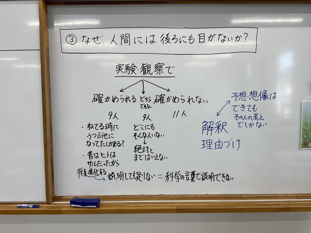 5・6年生を対象に「実験・観察で検証できる問い・検証できない問い」の授業を行いました。考えた問いは次の3つ。