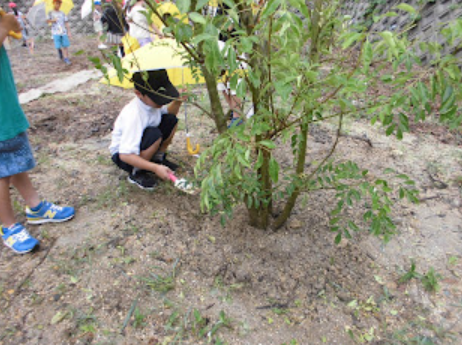 5月に保護者のご厚意により校内にある荒れ地を更地にしていただき、「生き物があつまる森」にするためのプロジェクトが始動した。「カブトムシやアゲハが集まるように木を植えたい」という意見が出て活動が大きく動き出した。そして、6月にクヌギやコナラなど9種類の苗木を植えた。当日は悪天候ではあったが、保護者や地域の方、芦屋大学の毛利先生のご協力のもと、思い出に残る植樹になった。その後ビニールハウスでのカブトムシの飼育、自作のトラップ(罠)作り等を行った。