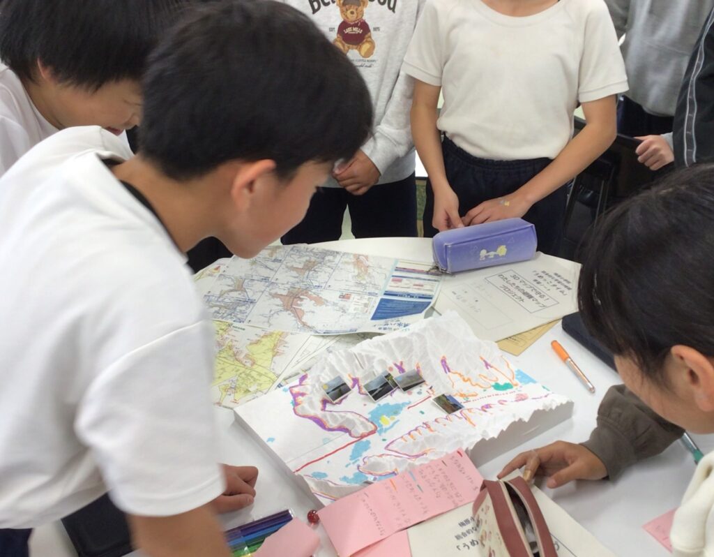 また、5・6年生を中心に取り組んだ「地域防災学習」では、毎年行う土砂災害対応訓練を起点に、地域の防災を自分ごととして捉える学習を展開した。児童は実際の地形観察、ハザードマップや立体地図の分析を行い、校区の地形的特徴を踏まえて危険箇所を探究した。立体地図上でビー玉を転がし、土砂や水の流れを再現することで、地域に潜む土砂災害・水害のリスクを視覚的に理解し、危険度を描き込んだ独自の防災マップを作成した。